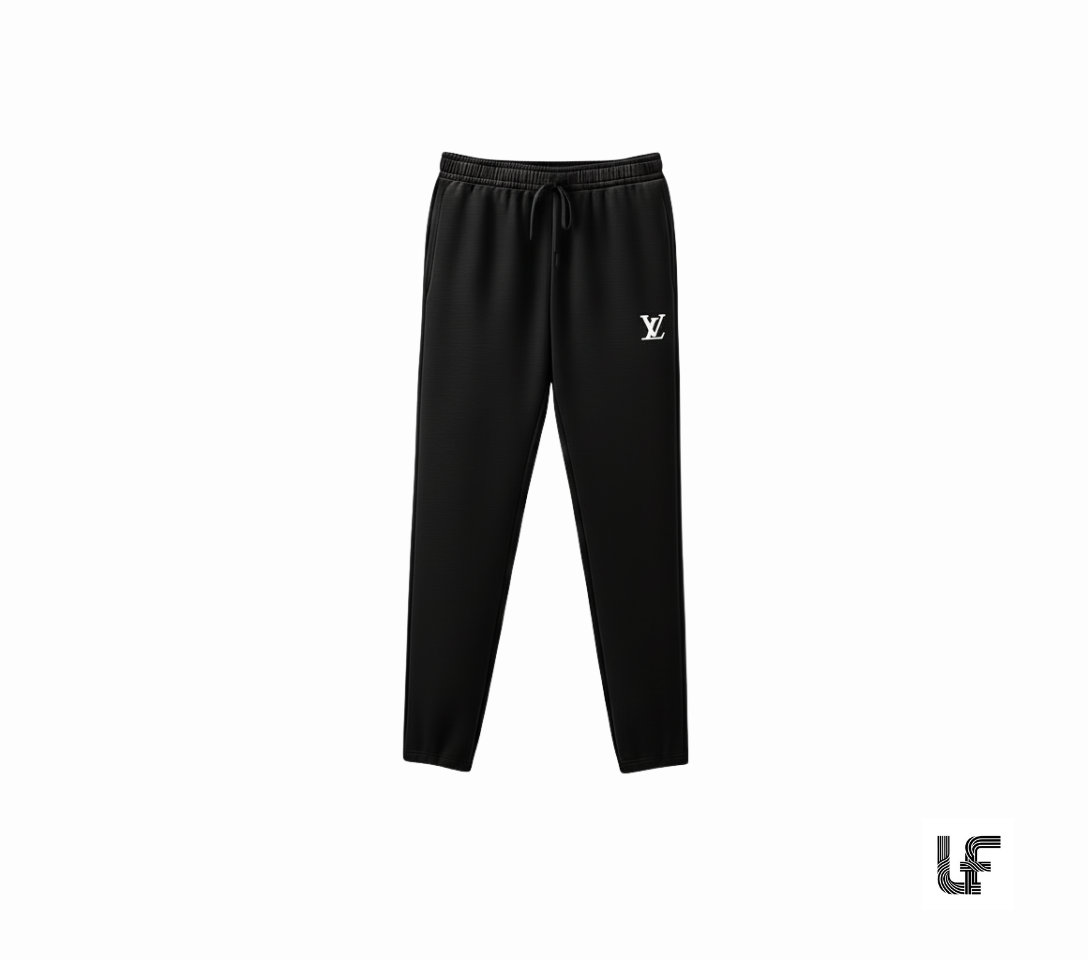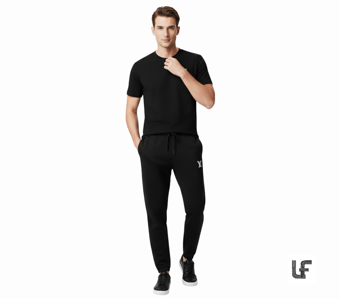 Elevate your casual wardrobe with our Signature Black T-Shirt and Joggers Set, the ultimate blend of luxury and athleisure comfort. This two-piece set features a classic black crewneck T-shirt and matching tapered joggers, both crafted from a soft, premium cotton blend for all-day wear. Each piece is tastefully accented with a clean, white embroidered LV signature logo, positioning this set as a refined statement piece perfect for travel, lounging, or stylish daily wear. Experience effortless, high-end dressing with a set that offers both a comfortable fit and an undeniably chic aesthetic.