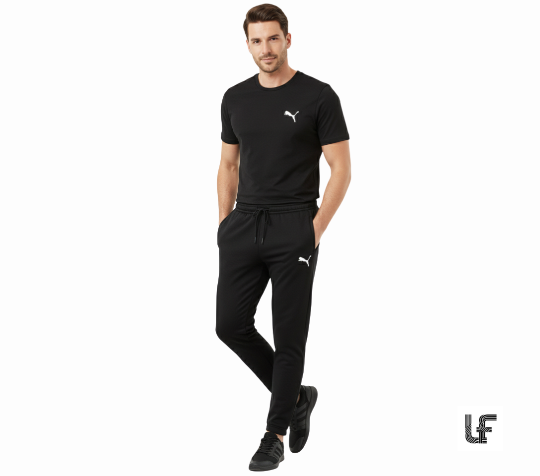 Elevate your casual wardrobe with our Signature Black T-Shirt and Joggers Set, the ultimate blend of luxury and athleisure comfort. This two-piece set features a classic black crewneck T-shirt and matching tapered joggers, both crafted from a soft, premium cotton blend for all-day wear. Each piece is tastefully accented with a clean, white embroidered PUMA signature logo, positioning this set as a refined statement piece perfect for travel, lounging, or stylish daily wear. Experience effortless, high-end dressing with a set that offers both a comfortable fit and an undeniably chic aesthetic.